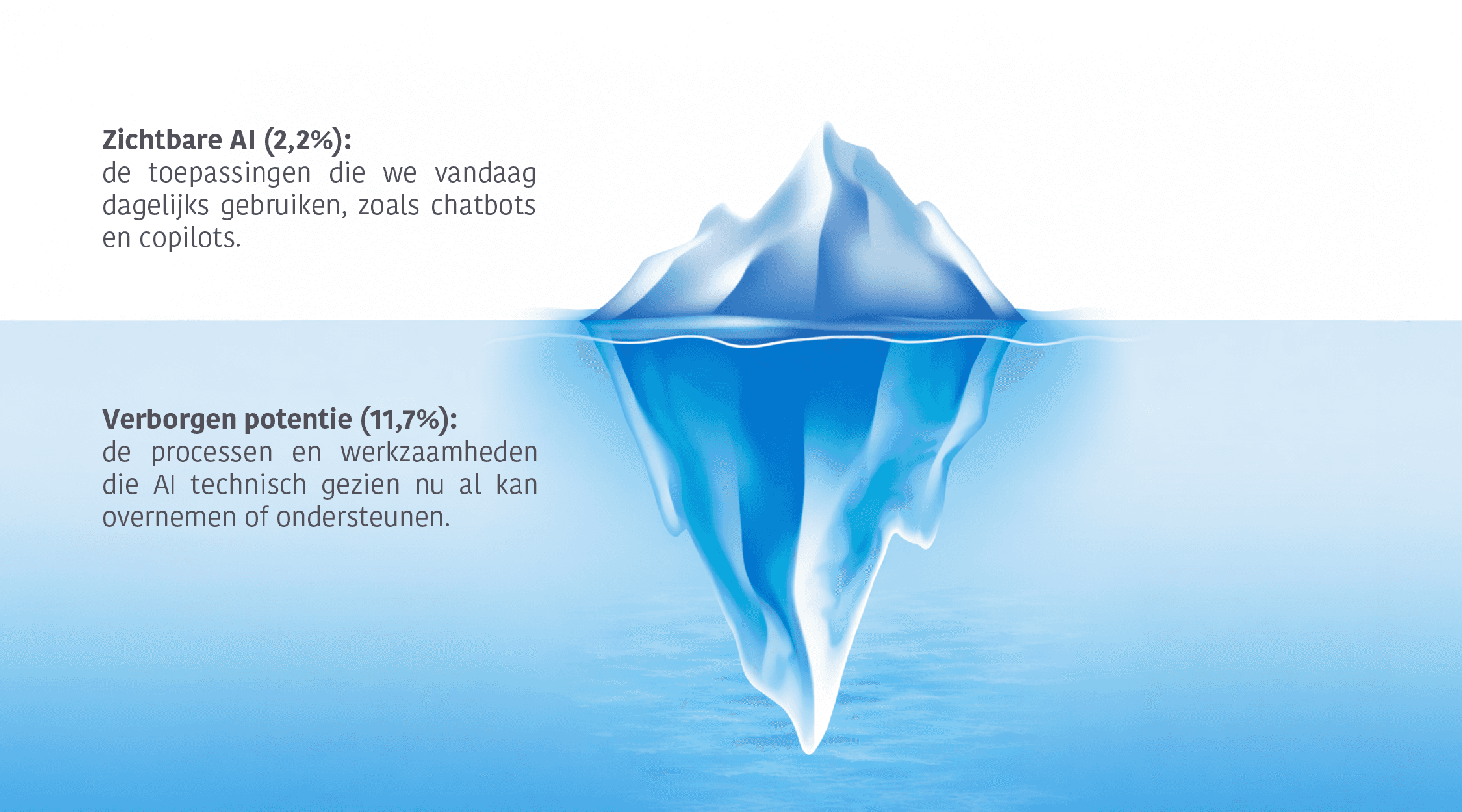 De onderzoekers beschrijven de impact van AI als een ijsberg. Wat we vandaag zien, de tools en toepassingen die dagelijks worden gebruikt, is slechts het topje boven water. Onder de oppervlakte bevindt zich een veel grotere laag van mogelijkheden die nog nauwelijks benut wordt.